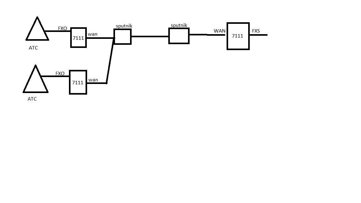 Желаемую схему нарисовал. Возможно ли это сделать через HotLine? Без сервера? С двумя VoIP шлюзами получилось, как быть с тремя?