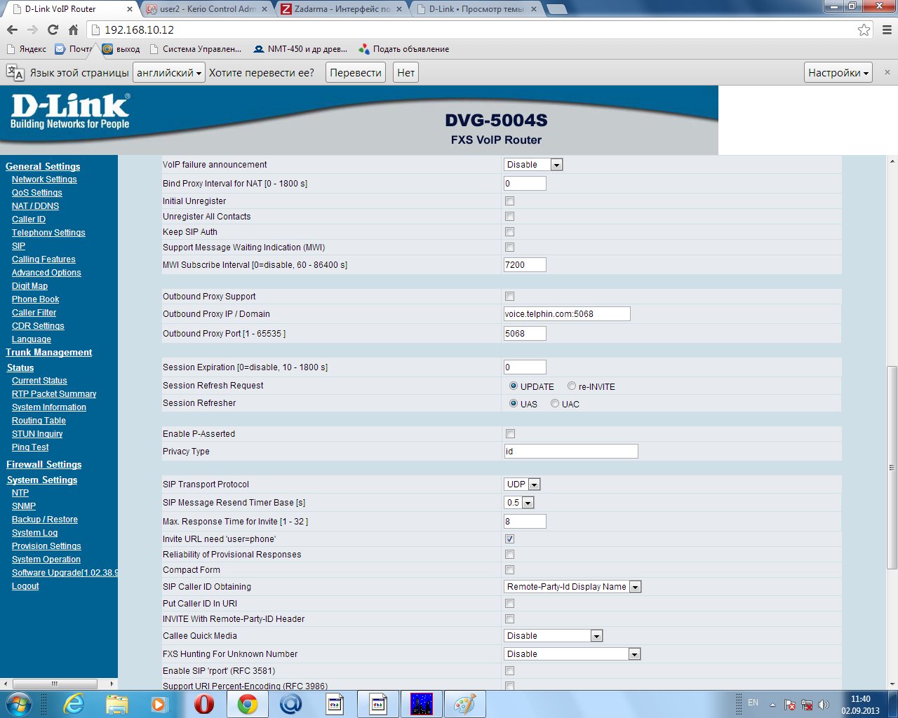 11:37:36 [000133] Login == Ver(1.02.38.93.8338 2012/08/23 15:21:13) PId(242.DLink.NoPrefix.drtp.vlan) Drv(1.2.1.2158) Hw(SA7S4) == 0.6.7-1 11:37:40 [000169] NetLink(0) On 11:37:40 [000169] NetLink(1) Off 11:37:40 [000169] NetLink(2) Off 11:37:40 [000169] NetLink(3) Off 11:37:40 [000169] NetLink(4) Off 11:37:51 [000280] 4: Register Retry 11:37:51 [000280] 15788-100: Reg Not Performed 11:37:54 [000312] (S0) Chk RegPxy(0) Dn 11:37:54 [000312] *** Start Dns Query [_sip._udp.pbx.zadarma.com] 2 #2 11:38:08 [000449] Something Changed! 11:38:08 [000449] GRP_SIP 11:38:08 [000450] GRP_DIALING_PLAN 11:38:10 [000468] (S0) Chk RegPxy(0) Dn 11:38:10 [000468] *** Start Dns Query [_sip._udp.pbx.zadarma.com] 2 #2 11:38:12 [000492] 4: Register Retry 11:38:12 [000492] 15788-100: Reg Not Performed 11:38:14 [000509] Something Changed! 11:38:20 [000549] Something Changed! 11:38:21 [000558] Quit 11:38:21 [000558] UnregisterAll 11:38:21 [000558] 15788-100: Reg Not Performed 11:38:57 [000098] Receive Cmd=1100, ParaLen=5, Para=[Login] 11:38:57 [000098] Login == Ver(1.02.38.93.8338 2012/08/23 15:21:13) PId(242.DLink.NoPrefix.drtp.vlan) Drv(1.2.1.2158) Hw(SA7S4) == 0.6.7-1 11:39:03 [000166] NetLink(0) On 11:39:03 [000166] NetLink(1) Off 11:39:03 [000166] NetLink(2) Off 11:39:03 [000166] NetLink(3) Off 11:39:03 [000166] NetLink(4) Off 11:39:17 [000309] 4: Register Retry 11:39:18 [000309] 4: 15788-101=REGISTER 11:39:18 [000309] (S0) Chk RegPxy(0) Dn 11:39:18 [000309] *** Start Dns Query [pbx.zadarma.com] 0 #2 11:39:18 [000313] Dn(pbx.zadarma.com)=176.9.85.133 11:39:38 [000517] 4: Register Retry 11:39:38 [000517] 4: 15788-101=REGISTER 11:39:38 [000517] (S0) Chk RegPxy(0) Dn 11:39:38 [000517] *** Start Dns Query [pbx.zadarma.com] 0 #2 11:39:39 [000521] Dn(pbx.zadarma.com)=176.9.85.133 11:40:00 [000729] 4: Register Retry 11:40:00 [000729] 4: 15788-101=REGISTER 11:40:00 [000729] (S0) Chk RegPxy(0) Dn 11:40:00 [000729] *** Start Dns Query [pbx.zadarma.com] 0 #2 11:40:00 [000733] Dn(pbx.zadarma.com)=176.9.85.133 11:40:20 [000937] 4: Register Retry 11:40:20 [000937] 4: 15788-101=REGISTER 11:40:20 [000937] (S0) Chk RegPxy(0) Dn 11:40:20 [000937] *** Start Dns Query [pbx.zadarma.com] 0 #2 11:40:21 [000941] Dn(pbx.zadarma.com)=176.9.85.133 11:40:41 [001149] 4: Register Retry 11:40:42 [001149] 4: 15788-101=REGISTER 11:40:42 [001149] (S0) Chk RegPxy(0) Dn 11:40:42 [001149] *** Start Dns Query [pbx.zadarma.com] 0 #2 11:40:42 [001153] Dn(pbx.zadarma.com)=176.9.85.133 11:41:02 [001357] 4: Register Retry 11:41:02 [001357] 4: 15788-101=REGISTER 11:41:02 [001357] (S0) Chk RegPxy(0) Dn 11:41:02 [001357] *** Start Dns Query [pbx.zadarma.com] 0 #2 11:41:03 [001361] Dn(pbx.zadarma.com)=176.9.85.133 11:41:23 [001569] 4: Register Retry 11:41:24 [001569] 4: 15788-101=REGISTER 11:41:24 [001569] (S0) Chk RegPxy(0) Dn 11:41:24 [001569] *** Start Dns Query [pbx.zadarma.com] 0 #2 11:41:24 [001573] Dn(pbx.zadarma.com)=176.9.85.133 11:41:44 [001777] 4: Register Retry 11:41:44 [001777] 4: 15788-101=REGISTER 11:41:44 [001777] (S0) Chk RegPxy(0) Dn 11:41:44 [001777] *** Start Dns Query [pbx.zadarma.com] 0 #2 11:41:45 [001781] Dn(pbx.zadarma.com)=176.9.85.133 11:42:05 [001989] 4: Register Retry 11:42:06 [001989] 4: 15788-101=REGISTER 11:42:06 [001989] (S0) Chk RegPxy(0) Dn 11:42:06 [001989] *** Start Dns Query [pbx.zadarma.com] 0 #2 11:42:06 [001993] Dn(pbx.zadarma.com)=176.9.85.133 11:42:26 [002197] 4: Register Retry 11:42:26 [002197] 4: 15788-101=REGISTER 11:42:26 [002197] (S0) Chk RegPxy(0) Dn 11:42:26 [002197] *** Start Dns Query [pbx.zadarma.com] 0 #2 11:42:27 [002201] Dn(pbx.zadarma.com)=176.9.85.133 11:42:47 [002409] 4: Register Retry 11:42:48 [002409] 4: 15788-101=REGISTER 11:42:48 [002409] (S0) Chk RegPxy(0) Dn 11:42:48 [002409] *** Start Dns Query [pbx.zadarma.com] 0 #2 11:42:48 [002413] Dn(pbx.zadarma.com)=176.9.85.133