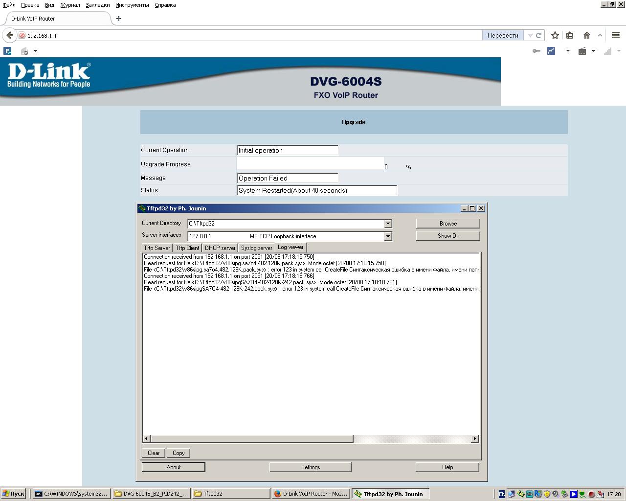 Всем привет. При прошивке шлюза DVG-6004S через tftpfd32 появляется ошибка "Operation Faled" (на шлюзе) и "Синтаксическая ошибка в имени файла, имени папки или метке тома" (в логе программы). Шлюз и компьютер находятся в одной подсети. Текущие параметры шлюза: PID 242 F/W 1.02.37.61.8258 2008/02/20 H/W ver. B2 Для прошивки использовал DVG-6004S_B2_PID242_1.2.38.95.8558_1.2.1.2172(0206121239) с сайта.