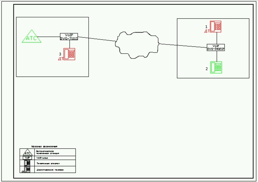 Добрый день! Хочу перестраховаться и узнать точно ли возможно задуманное. Есть два шлюза, 7111s и 5402sp, соеденены по схеме точка-точка. К 5402 подкючены два телефонных аппарата, на схеме красный аппарат 1 диспетчерский, 2 зеленый номерной. На втором шлюзе 7111s k fxs подключен телефонный аппарат 3(тоже диспетчерский), к FXO выход на АТС (выделено зеленым). Задача выдать линию с АТС на 2-й аппрарат (зеленый) и сделать двухстороннюю диспетчерскую связь между первым и третьим аппаратами. С этими шлюзами это возможно?