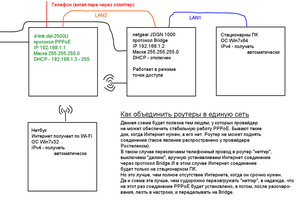 Запустил "делинк". Есть соединение. И хорошо. Нет его. Выключил "делинк". Подключился вручную через Bridge на "нетгире". Вот я нашел старый свой "делинк", и задался вопросом: Как d-link dsl-2500u подключить к другому роутеру или модему?