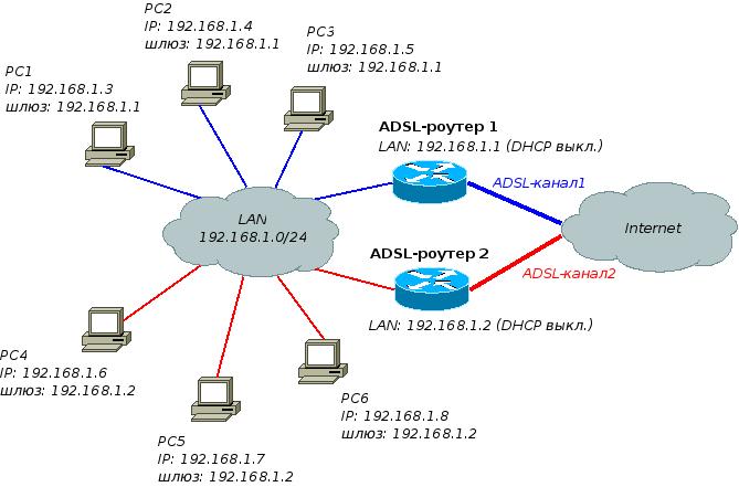 Правильно ли я понимаю, что оба ADSL-модема настроены в режиме маршрутизатора и подключены к двум ADSL-линиям, а по LAN-интерфейсам они объедены в одну внутреннюю сеть (см. рис.)?