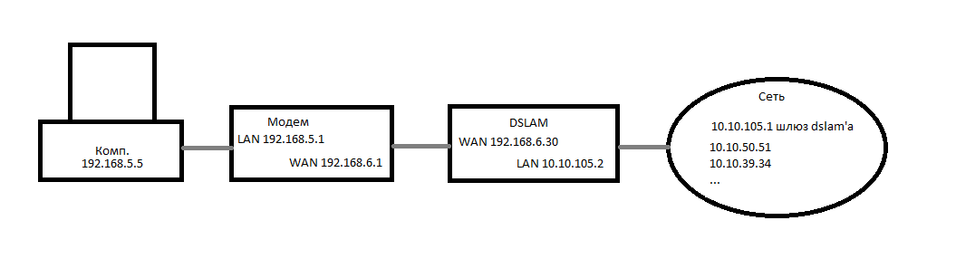 После настройки модем соединяется и работает (видно всю сеть и с PC и с модема) до тех пор пока его не перезагрузишь. После этого он видит только до 10.10.105.2, на остальные адреса "превышен интервал ожидания". Причём в веб-интерфейсе LAN и WAN порты подключены, в логах пишется "received valid ip address from server". Это со стороны модема. Со стороны остальной сети можно пропинговать и модем и РС, залогиниться на модем и т. д. Это повторяется не с конкретным модемом, а с несколькими из одной поставки. Порты DSLAM меняли.