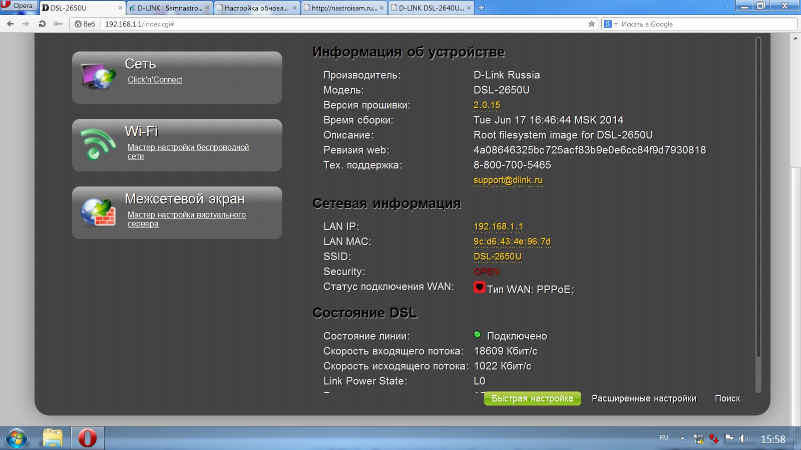 Вобщем расклад такой.Лет 8 подлючался к инету через DSL-100 и не парился.Но вот приобрёл ТВ панель со СмартТВ и очень уж мне захотелось энто самое Смарт позырить.Подключать есно надоть через роутер и старый модем тут ну никак.Вобщем приобрёл я девайсик DSL-2650U,ну чтоб инет на комп и на телек хватило.Кабели пристегнул и включил роутер,комп и ТВ.Загорелся светодиодик Power,помигал и также загорелся DSL,Wlan постояно мигает и загорелись LAN1 и LAN2 к которым подсоединены сетевые кабеля.Потом начал настраивать через браузер.Там всё через мастер настройки и в результате получилось вот это: