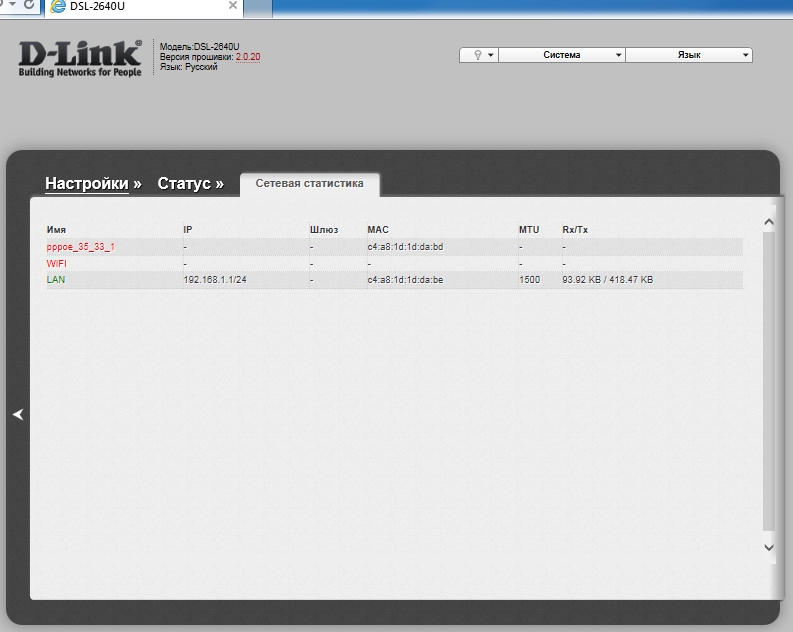В разделе Статус/Сетевая статистика, как отображается статус соединения?