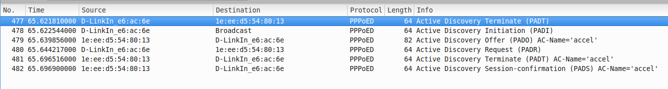 После модем отправляет PADI пакет серверу на установку новой сессии, но ответ от сервера так и не получает. В итоге