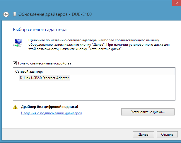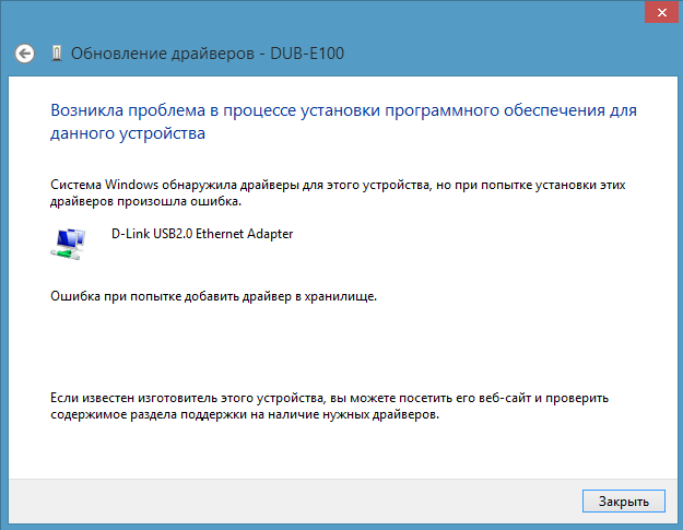 Здравствуйте! Устройство dlink dub-e100 c1 отказывается работать в windows 8 x64, а теперь еще и в windows 8.1 x64. При попытке установки последних драйверов с фтп. ftp://ftp.dlink.ru/pub/usb/DUB-E100/Drivers/dub-e100_win8_driver_v3.16.2.0(43658764)(0819095614).rar Система пишет, что драйвер без цифровой подписи и работать отказывается. Не устанавливаются драйвера. Когда будет решена данная проблема? Когда подпишете драйвера для нормальной установки устройства?