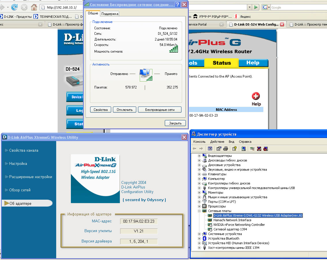 В упомянутой ветке сошлись все во мнении, что причина тому уже не настройка самого DI-524, а именно сам адаптер DWL G132. Точнее драйвера к нему.