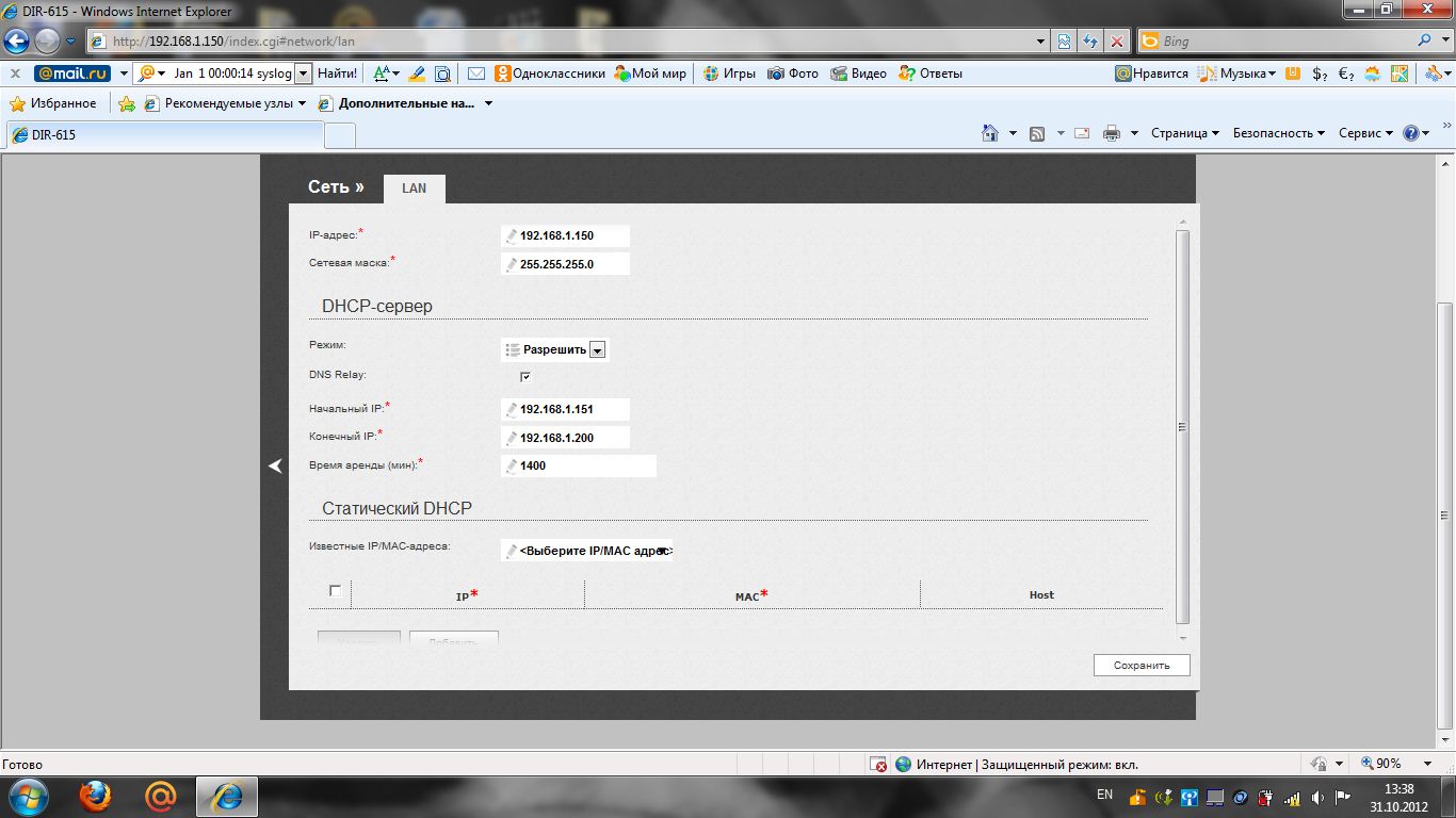 Аж зарегистрироваться пришлось! Да как так то, как будто в первый раз прошивки пишете! Какая прошивка один фиг лаги! С телевизором купил сие чудо DIR-615 K1, ну да ладно дома с горя пополам работал хоть IPTV не работало на первых прошивках и вис часто! Сейчас IPTV не нужно, поэтому не проверял! Дома на 1.0.10 соединение PPOE сейчас вроде инет раздает без особых проблем, глюков не замечал! Проблема в том что на работу пришло 5 еще таких! Перепробовал все прошивки, сейчас на 1.0.10, меняю IP маршрутизатора на 192.168.1.150, подключение "Динамический IP"! На заводские настройки после прошивки сбрасывал! Не работает ни локально, ни по WIFI! Локальную сеть тоже не видит! Скрины, логи прилагаю! В настройках просто поменял IP и настроил вафлю!!!