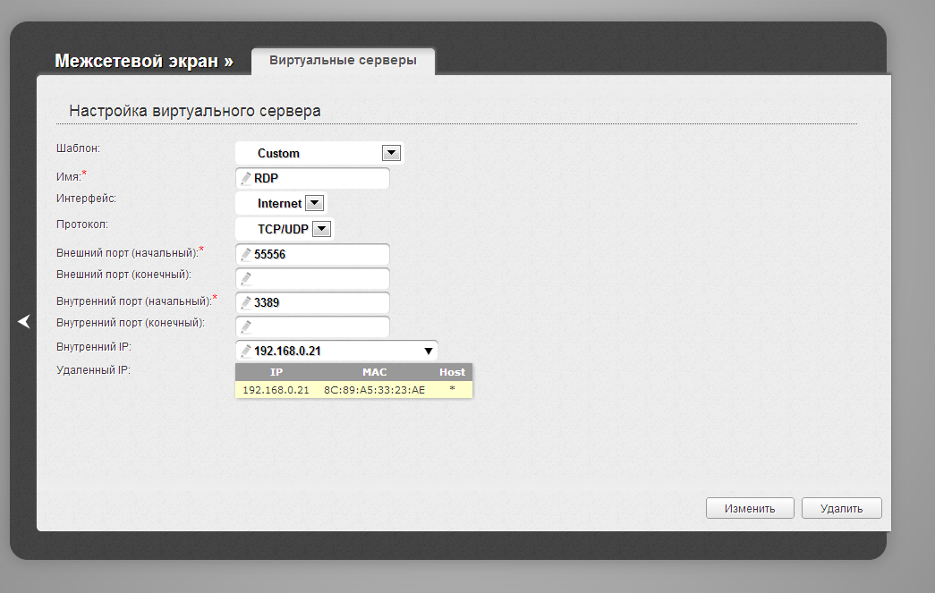 Да там же все проще некуда. Например: Откроем себе извне порт 555556 для доступа к локальному компьютеру через "Подключение к удаленному рабочему столу". Идём в Межсетевой экран -> Виртуальные серверы, там жмем "Добавить".