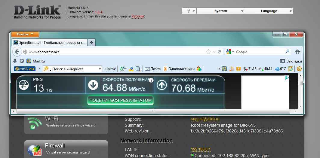 По тестам сайта speedtest.net скорость с прошивкой 1.0.0 была (скорость загрузки 35 Мбит/с, скорость передачи была около 30 Мбит/с)