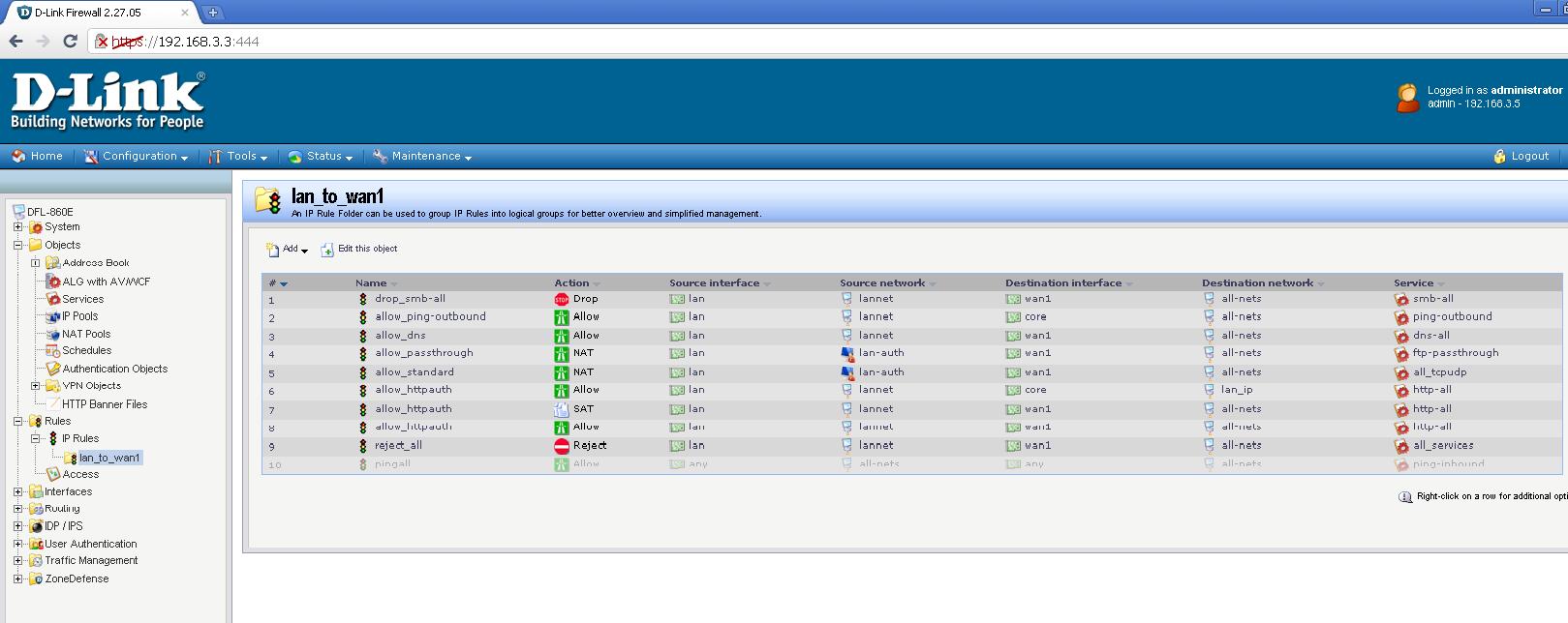 Доброго дня! Никак не могу настроить DFL860E на статический адрес првайдера. Адреса вбиты, с железки DNS провайдера пингуется. авторизация локальных пользователей проходит, настраивал по этой ссылке http://www.dlink.ru/ru/faq/85/574.html но нет пинга с локального компа до провайдера (соответственно инета тоже). Создавал только правила и то, что указано в инструкции по ссылке выше. Что нитак сделал, и где я пропустил?