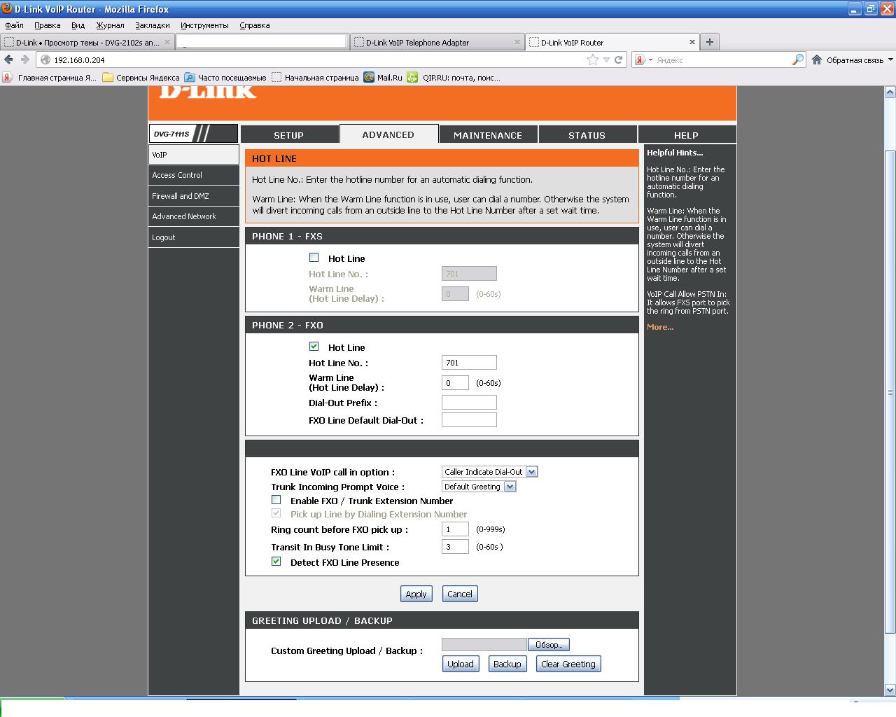 настройки DVG-7111s данный модем подключен к телефонной линии