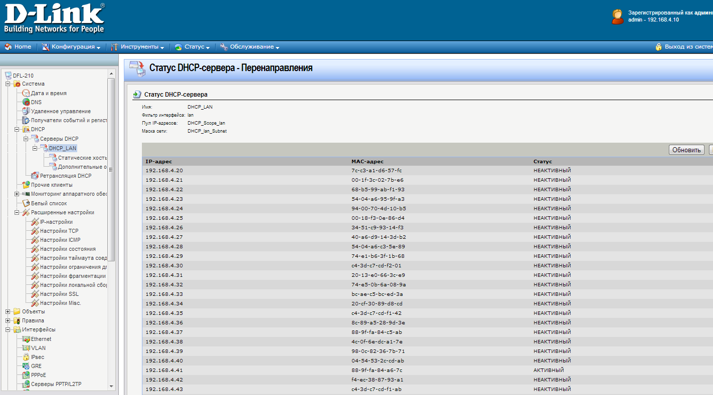 Заголовок сообщения: DFL 210 настройка аренды ip в DHCP