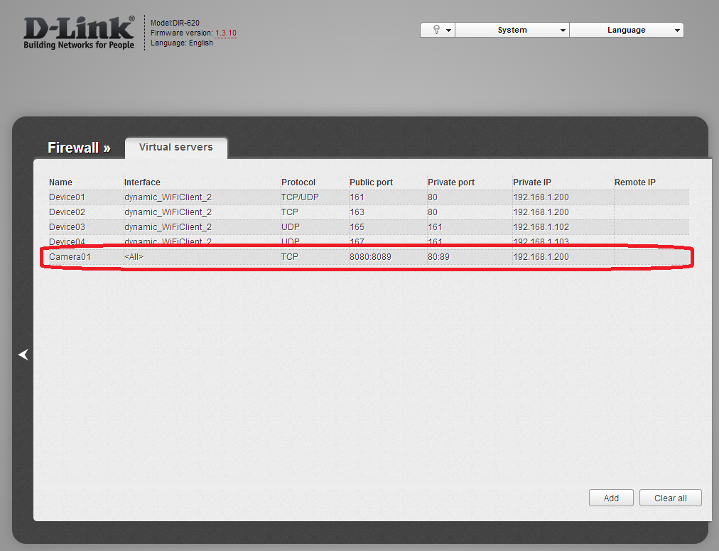 Имеется маршрутизатор D-Link DIR-620 rev.D1, прошивка 1.3.10. Выявлена некорректная работа для Virtual Servers, когда указан не один порт, а диапазон портов. Например, создаем пул Web-серверов начиная с 8080 по 8089 и перенаправляем их соответственно на 80 - 89: