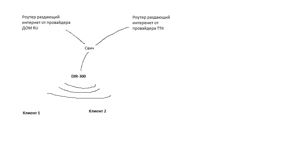 dir-300 подключён к локальной сети и через вай фай раздаёт интернет того провайдера, у которого ip адрес меньше.