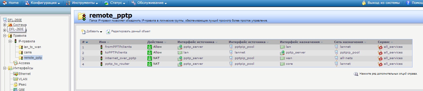 3 для хождения pptp клиентов через dfl в интернет