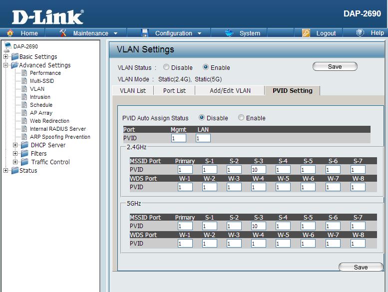 Есть массив из 2 точек DAP-2690 (обе с прошивкой 1.15). Раньше массив работал нормально. Теперь появилась необходимость в использовании VLAN’ов для разделения сети (корпоративную и гостевую). При активации VLAN на мастер точке массив моментально отваливается. При этом на мастер точке статус AP Array - connected, на slave точках - disconnected.