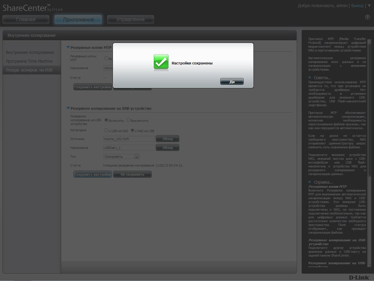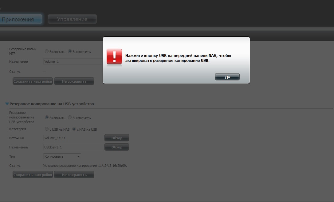 Не удается настроить резервное копирование с NAS на USB диск. После нажатия кнопки "Сохранить настройки" ничего не происходит. Взываю в первую очередь к модераторам: оно в принципе работает или даже в этом простом случае я что-то могу сделать неправильно?