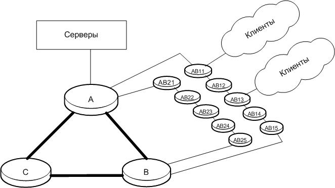 К каждой точке (A,B,C) подключено по 10 линий в каждой из которой по 4-5 маршрутизаторов. Полукольца. В каждой ветке AB1, AB2...BC3 и т.д. свой VLAN с небольшой подсетью /28.