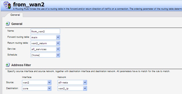 Ну, начнем с Routing Rules. №2 убираем, вместо него у нас №6. В №1 заменяем dst if на any. Таким образом у нас останутся №№5 и 6 для входящих и №№1, 3, 4 для исходящих, для которых приоритетней wan2. Соответственно таблица, обозванная alt (я бы ее обозвал wan2_priority) , будет только для исходящих, не путать ее с wan2_return! Правила для исходящих можно объединить в одно, сделав группу адресов wan2_users_nets. Для симметрии можно сделать еще одну таблицу wan1_priority и соответствующее правило. Но это уже эстетика :). В этой таблице (или таблицах) *_priority у нас будут только маршруты в Интернет (all-nets) через оба wan, с мониторингом и разными метриками.