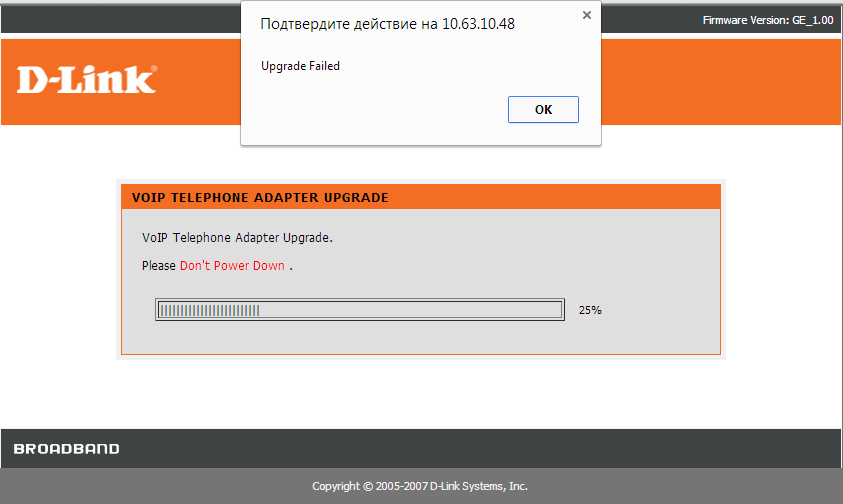 нет, не меняется. прошивку брал с ftp d-link'а, там 2 архива. качал оба. распаковываю содержание папки в архиве, то есть получается 2 файла, забрасываю на ftp сервер, пробую прошить, доходит до 25% и на этом всё, выдаёт ошибку и идёт в reboot