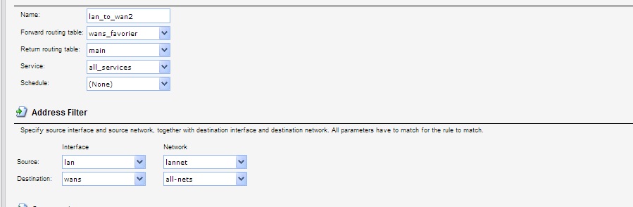 Непонятно, как в DFL создать правило для тех же и самых подсетей но на другой ip подобно cisci. Пробовал делать 2 правила, в итоге первое переключение иногда срабатывало, но при восстановлении WAN1 все зависало.