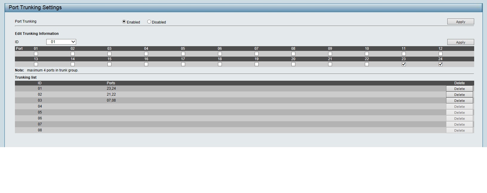 Подскажите пожалуйста как мне сделать правильно агрегацию портов между двумя устройствами D-link DGS-1100-24 Firmware 1.10.008 (я настроил Port Trunking на 23 и 24 порту на каждом D-Link в первом Vlan и соединил двумя пачкордами).