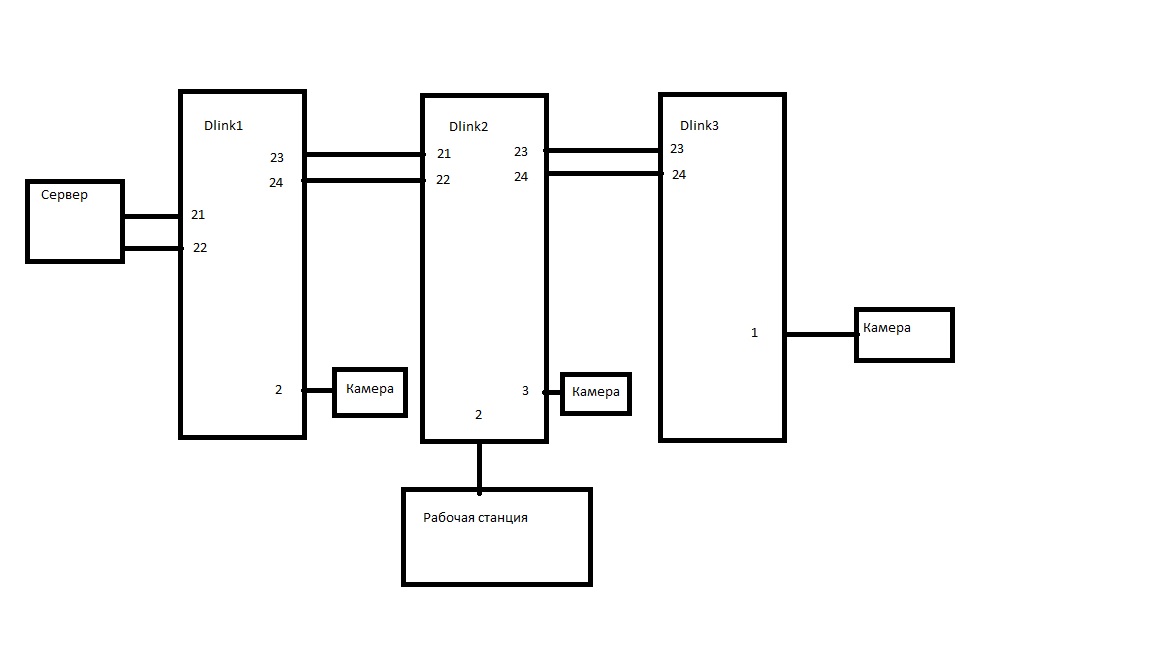 Топология примерно такая.Соответственно камеры пишутся на сервере и просматриваются с рабочей станции.