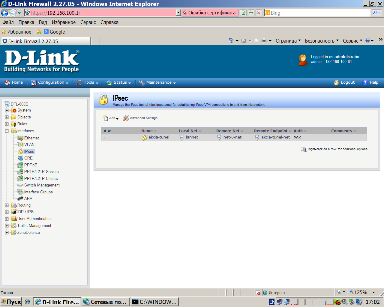 1. "Вы сначала должны создать несущую сеть" - делал по трем различным инструкциям (http://www.dlink.ru/ru/faq/85/575.html и http://d-link.ua/IPSec_DFL_DSR также пользовался официальной инструкцией от Dlink http://ftp.dlink.ru/pub/FireWall/DFL-860E/Description/ ) не получается соединить по ipsec.