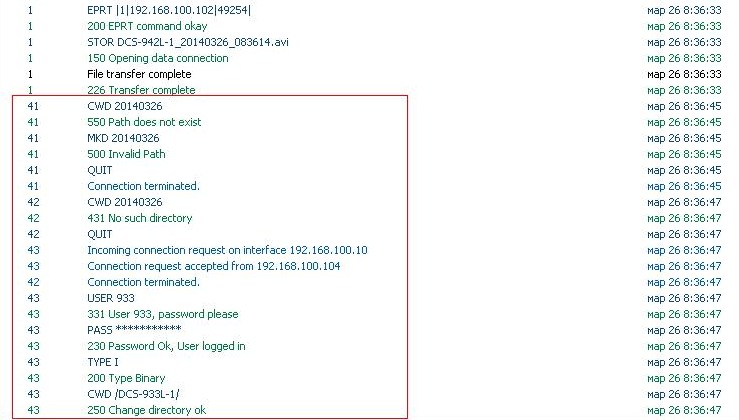 если вы удалили Patch параметр в настройках ftp 933 камеры,то соответственно в логах самого ftp сервера такой записи быть не должно (Change Working Directory выполняться не будет по /dcs-933l-1/ )