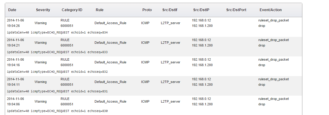 с Комп Б пытаюсь пропинговать lan интерфейс DFL (192.168.1.150) - пинги не проходят и вот что вижу в логах дфл: