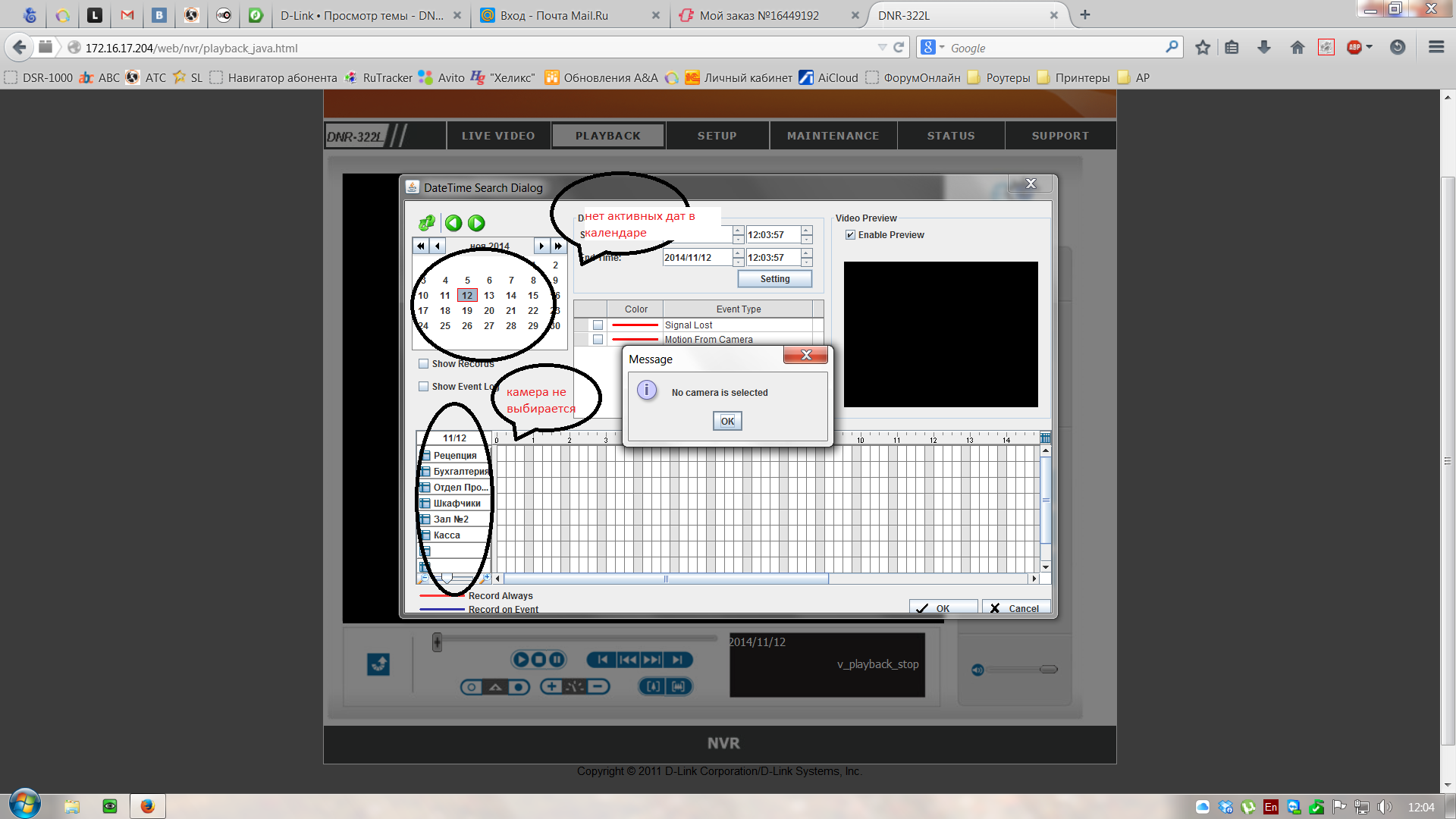 Здравствуйте, в PLAYBACK SYSTEM не выбирается камера для просмотра, подключаюсь к серверу, и в календаре неактивны даты записи , хотя на сервере папки с файлами ле;ат и все пишет , судя по MAIN CONSOLE/