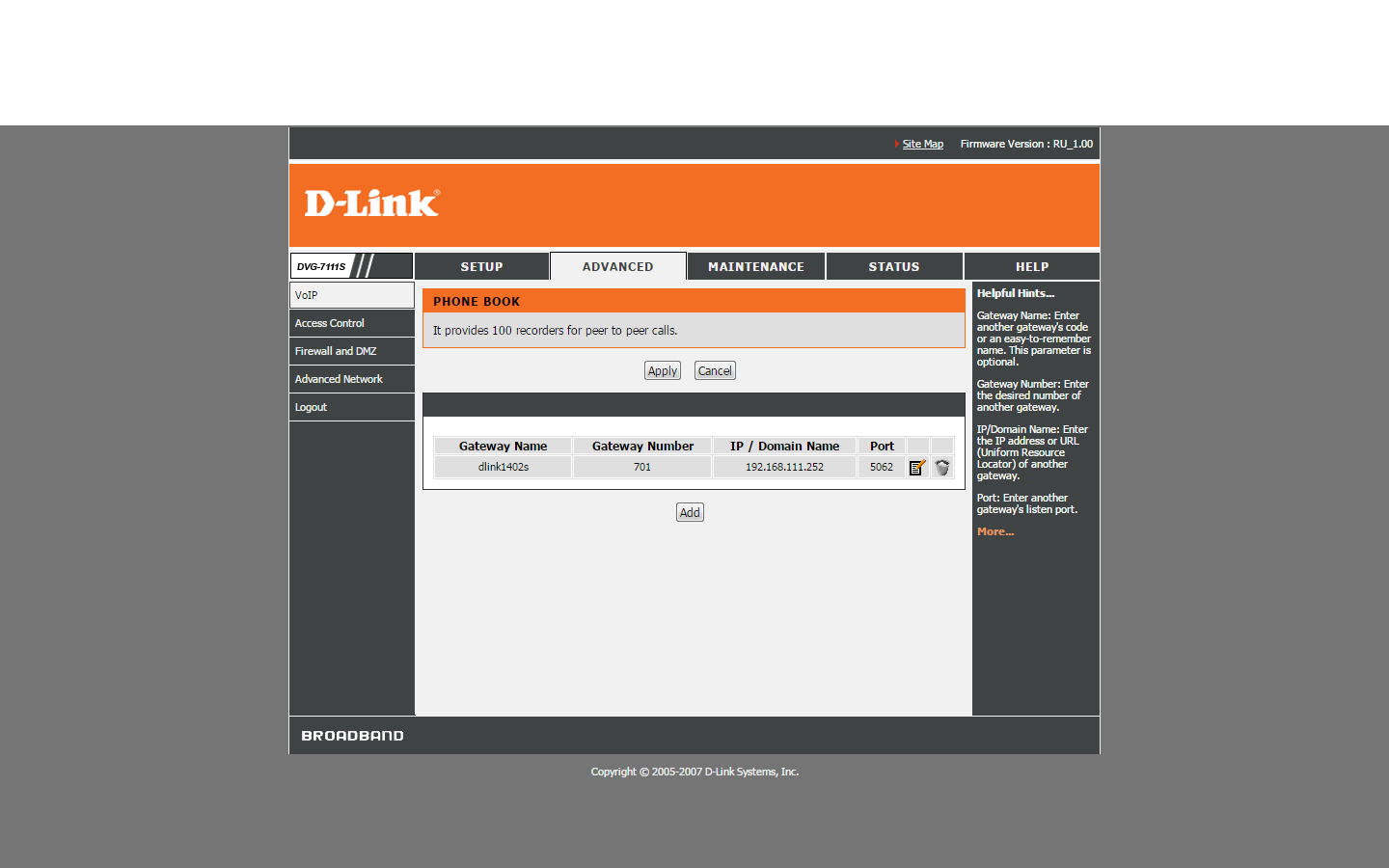 Тогда нужно смотреть дамп трафика между устройствами и логи slmon со шлюза DVG-7111S во время попытки вызова.