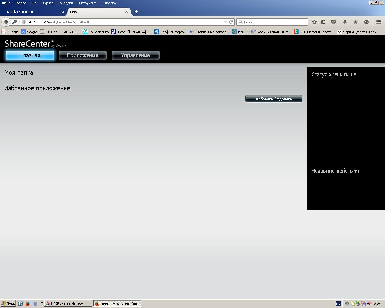 Еще добавлю, захожу по IP в браузере (с разных компов с разных браузеров) отображается окно с логином на английском языке, через секунд 5 становится по-русски (может через 7-8 секунд), логинюсь под именем и паролем и вижу только кнопки ГЛАВНАЯ УПРАВЛЕНИЕ ПРИЛОЖЕНИЯ. То есть дизайн веб морды подгружается, видно ЛОГО, справа колонка СТАТУС ХРАНИЛИЩА, НЕДАВНИЕ ДЕЙСТВИЯ, но всё пусто..... МОЯ ПАПКА - пусто, ИЗБРАННОЕ ПРИЛОЖЕНИЕ - пусто