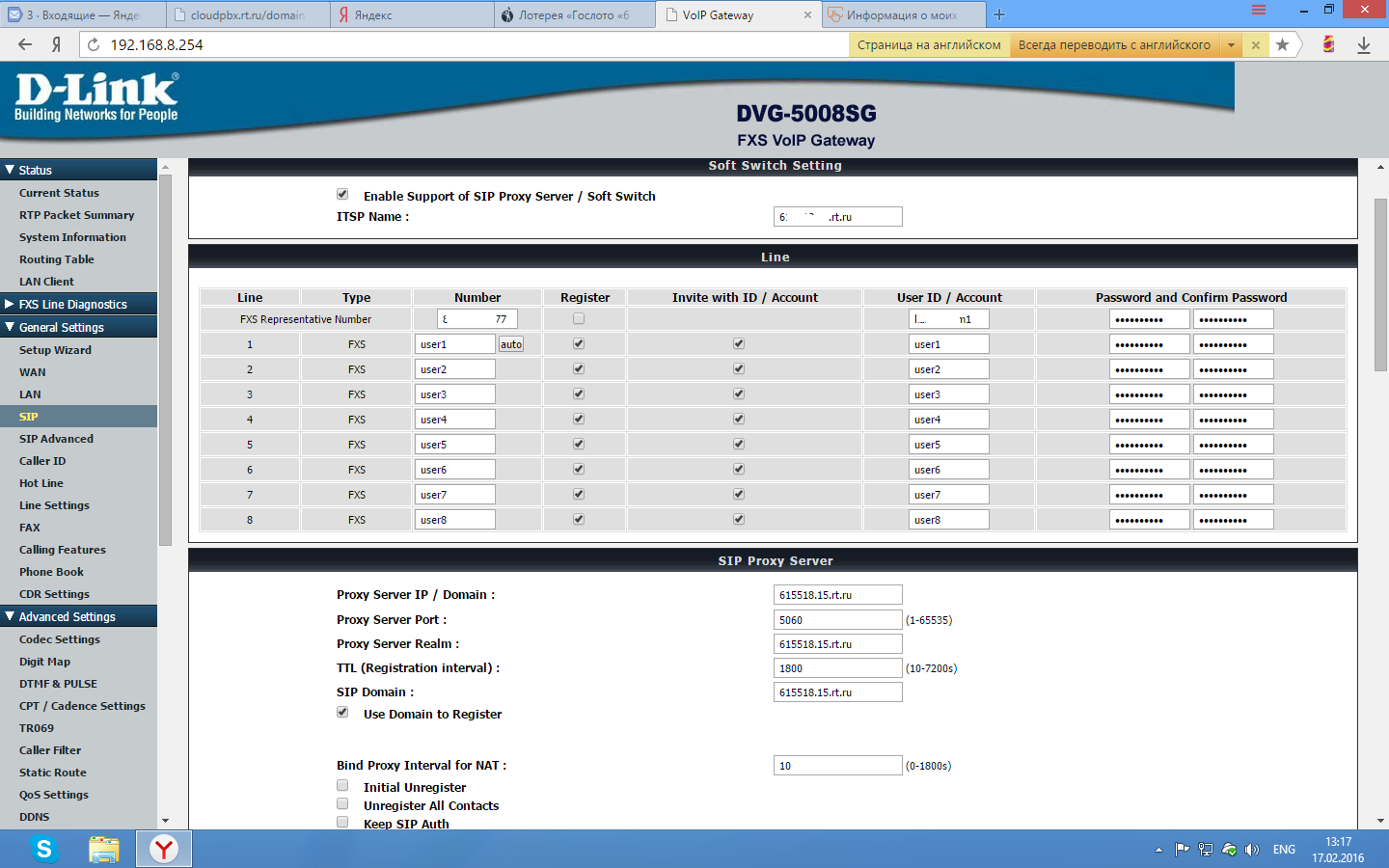 - В настройках SIP прописан SIP прокси сервер ростелекома, прописан логин и пароль в поле FXS Representative Number (галка register стоит)