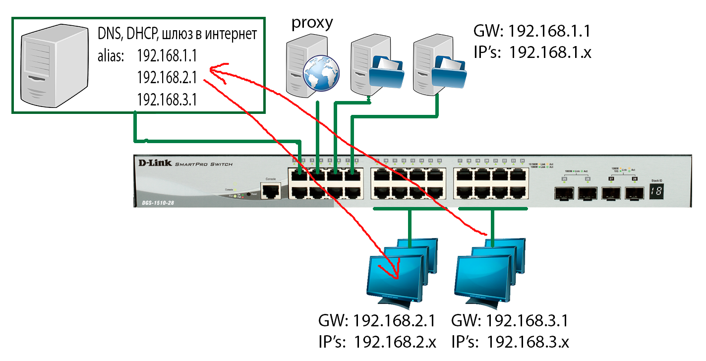 Есть DGS-1510-28X и сеть, как на приложенной схеме.
