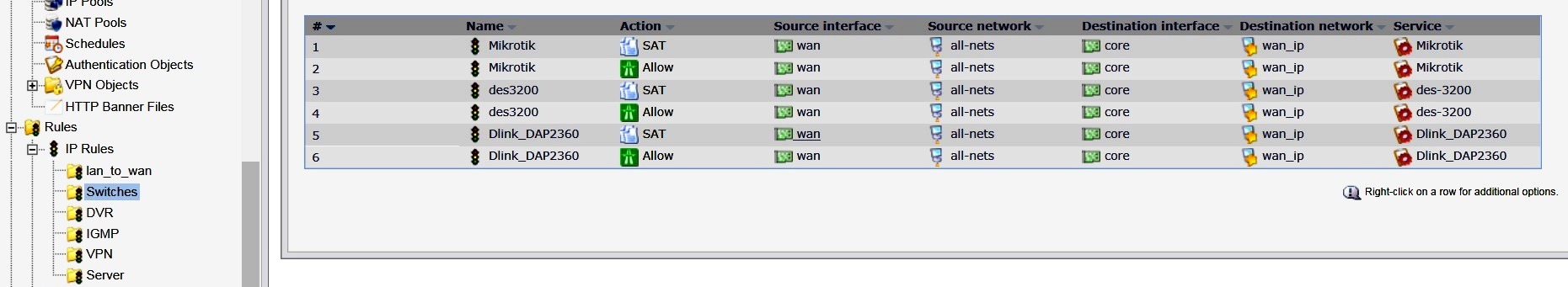 3. В папке IP Rules создал папку "Switches" в которой и описал правила переброса портов. На вкладке SAT правила "New IP Address:" - адрес точки из адресной книги. "New Port: - 80" (WEB интерфейс всех точек на 80 порту). При этом точно такое же правило "DES-3200" работает. Коммутатор доступен по обращении на внешний адрес на порт указанный в сервисе des-3200 (8080).