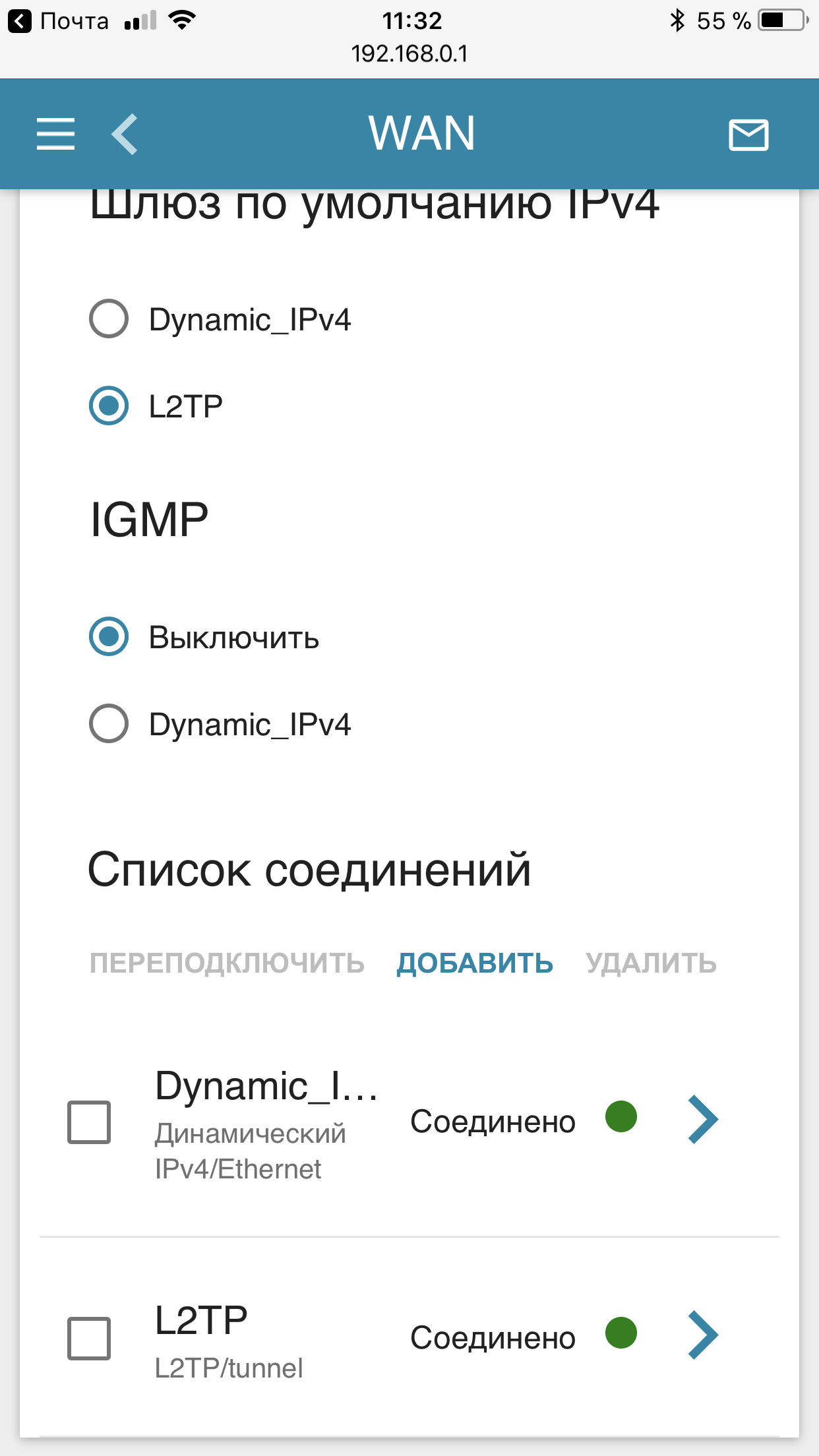 - Перейдите в раздел "Настройка соединений" - "WAN".