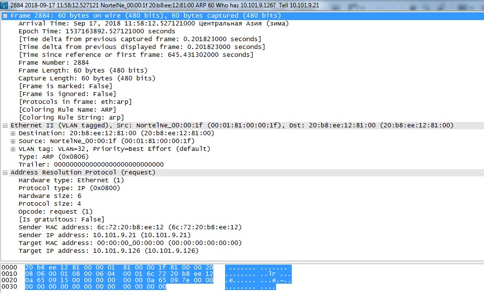 Здравствуйте! В сети присутствует пакет с ARP запросом странного содержания (в прикрепленном файле). Обратите внимание что MAC указанный в Ethernet не соответствуют MACом в пакете ARP. При этом MAC Dest Ethernet подозрительно похож на MAC sender ARP (совпадают 4 октета, просто смещены). Какая именно ситуация и условия могут привести к подобному?