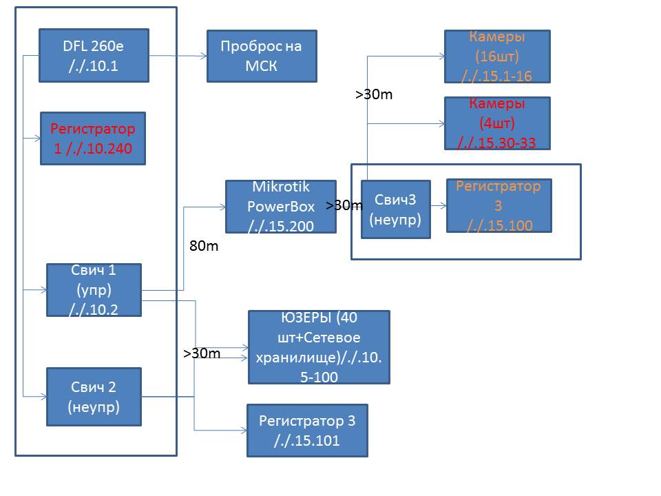 4) Из Микрота кабель спускается в ящик с еще одним неуправляемым свичом, к которому подключены 20 ip камер, два регистратора и одна вай фай точка. на камерах статика (10.222.15.1-10.222.15.16, 101, 100, 30-33)