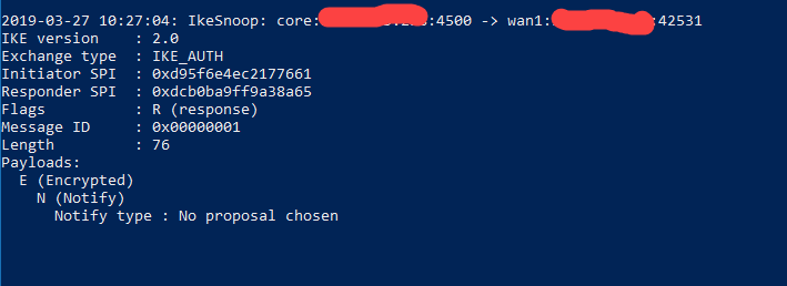 statusmsg="No proposal chosen" reason="" local_peer="xx.xx.xx.xx:500 ID (null)" remote_peer="yy.yy.yy.yy:500 ID (null)" spi_i=0x03bac29db904d498 spi_r=0xa7d26fb0595ac14b initiator=FALSE