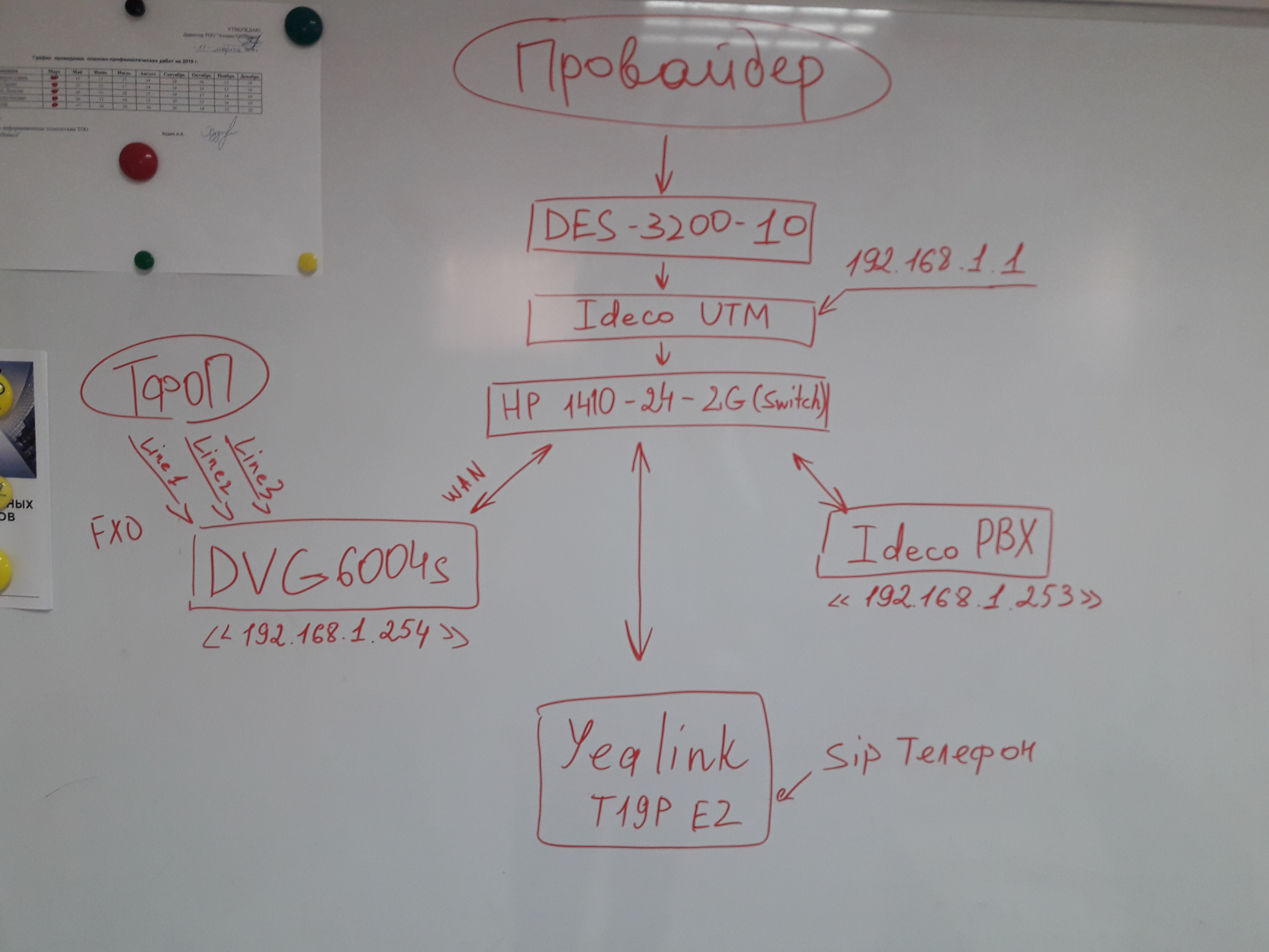 Схема подключения в настоящее время такая: D-Link DES-3200-10(Beeline Internet)+Ideco UTM(Шлюз безопасности)+HP 1410-24-2G(Switch)+D-link DVG-6004s(WAN подключенный к HP 1410-24-2G)+Ideco PBX(подключенный к HP 1410-24-2G).