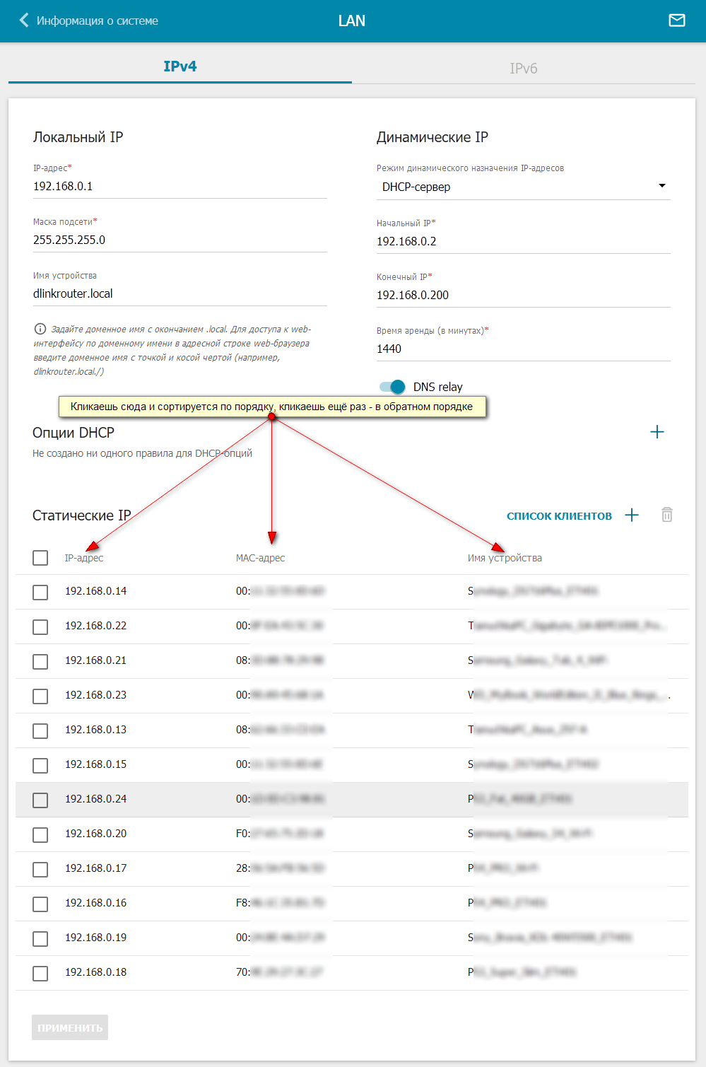 4) Можно ли сделать значения заголовков столбцов в списках, например, Статические IP раздела настройки LAN-соединений, кликабельными, чтобы можно было сортировать соответствующие данные: по IPшнику, по имени или MACу?