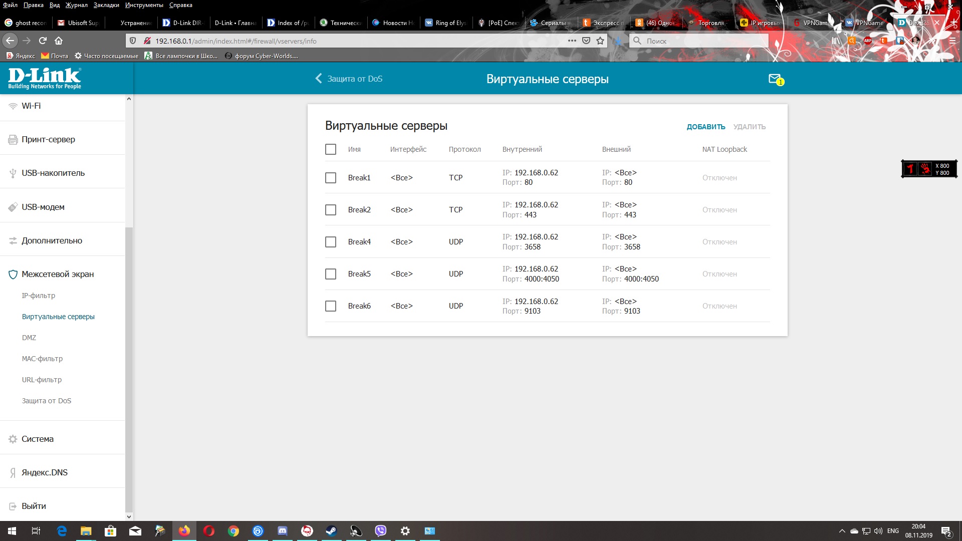 Маршрутиризатор D link 825 не получается открыть порты. Даже после настройки портов,они остаются закрытыми. Для игры Ghost Recon breakpoint нужны порты TCP: 80, 443