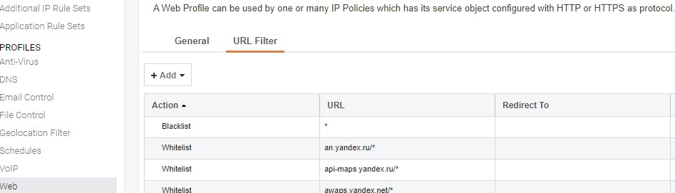 Имеем настройку доступа с хоста по определенному перечню URL, определенному в правиле "Access_to_some_url" (IP Policy/Web Control -> Web profile)