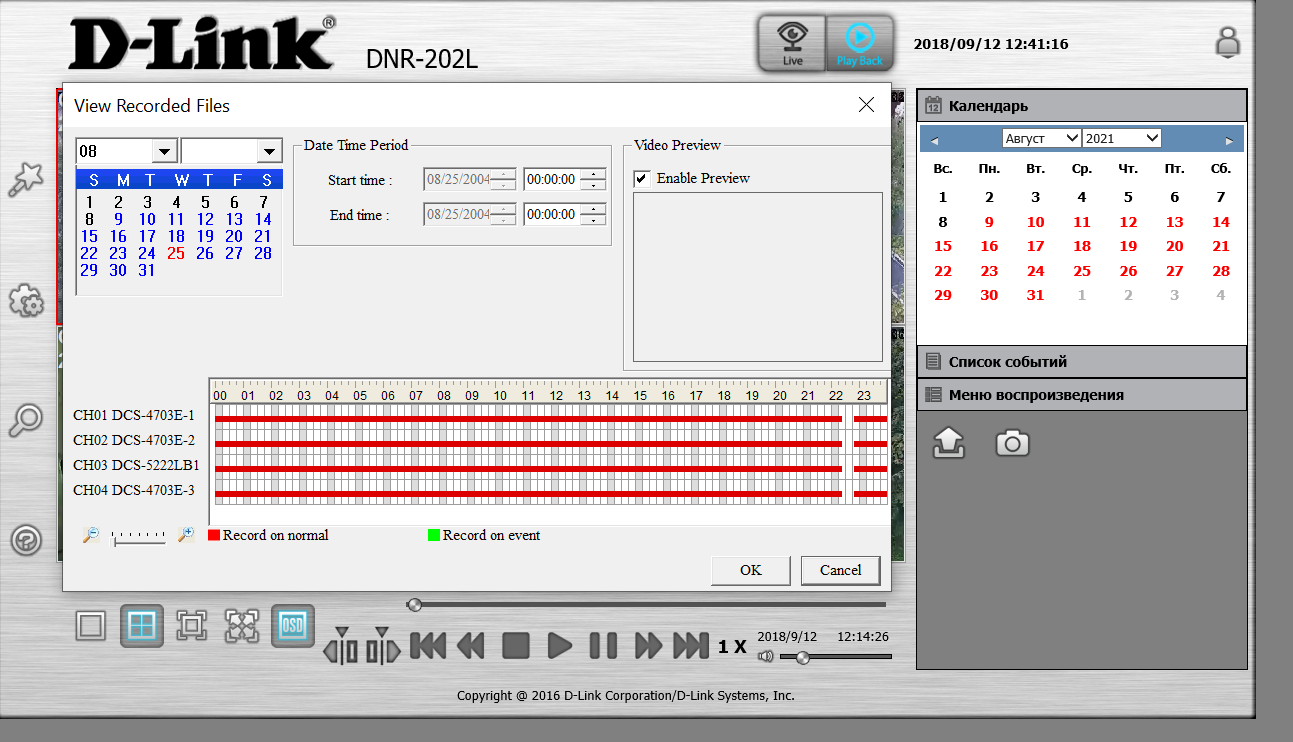 Комментарий к файлу: При выборе в основном окне даты 25 июля 2021г. во всплыващем окне отображаются некорректные даты (откуда-то берётс 2004г., который невозможно изменить вручную), после чего воспроизведение не срабатывает (см. 2021-09-12_12-43-07.png)