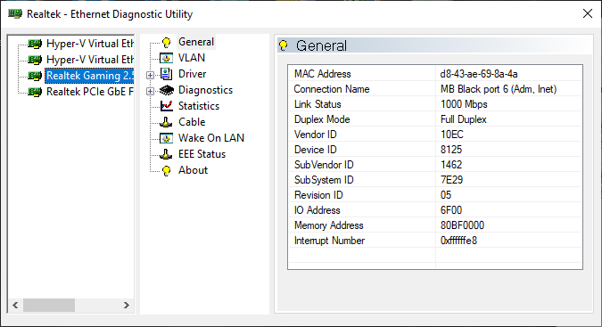 Однако при запуске Realtek Ethernet Diagnostic Utility 2.0.7.3 только на бортовой сетевой карте имеется полноценная поддержка 802.1Q.